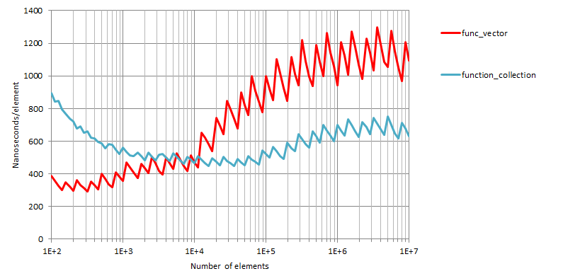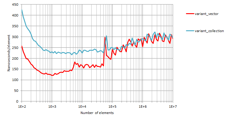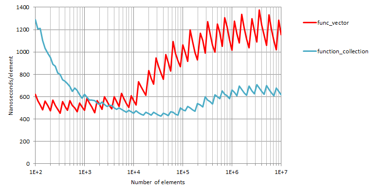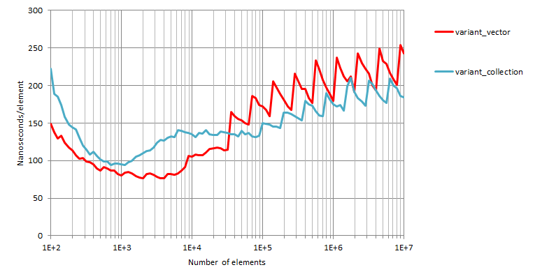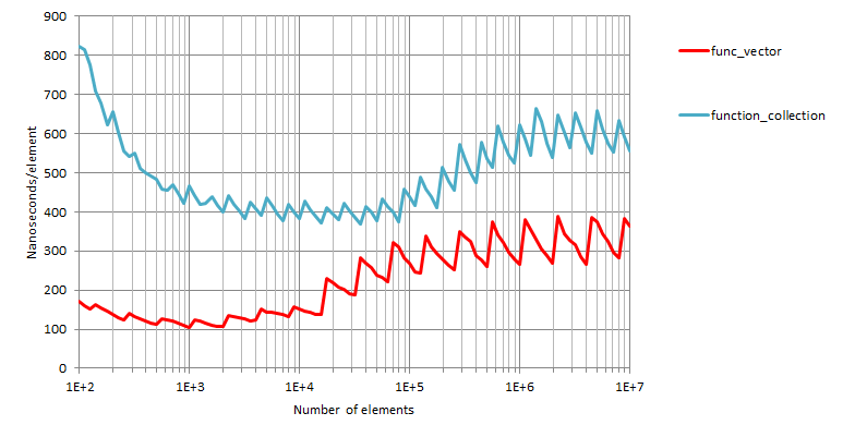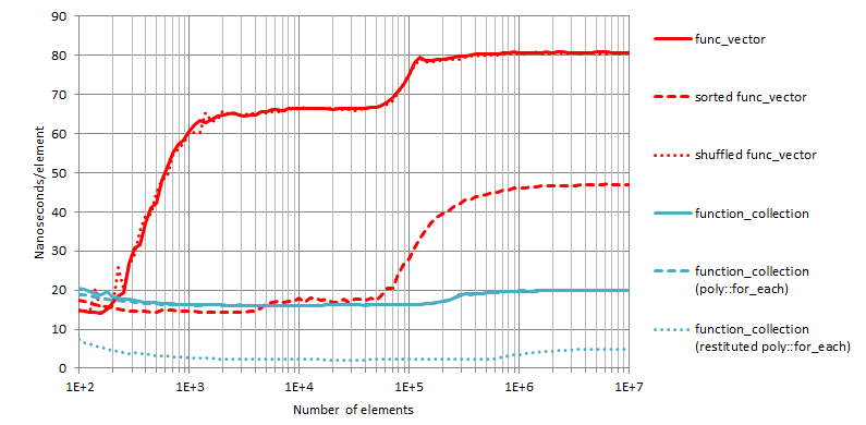 The figures show resulting times in nanoseconds/element. The horizontal axis is logarithmic.